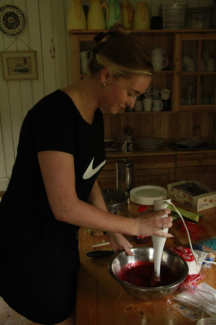 Päris suur action oli jahusõda. Kõigepealt nad maalisid ennast guaššvärvidega ära. Alissa oli väga õnnelik, et ta sai oma mamma peale joonistada :D Osavõtjaid oli uskumatud 11 inimest. Kui kõik olid oma maalingud ära teinud, võeti positsioonid sisse ja algas jahu loopimine üksteise pihta. Jõhker, millised nad välja nägid! Ja kui nad veel meres pesema läksid, siis muutus see jahu nende kehal ja juustel taignaks. Kõige hullem oli see, et guaššvärv ei tulnud nende pealt maha :D Läks ainult laili, aga maha ei tulnud. Arvo lohutas kõiki, et õhtul saunas higistades ja duššigeeliga pestes kõik saavad puhtaks, aga nendel, kellel see värv näos oli, oli ikka nalja nabani. Õnneks keegi avastas, et meigieemaldajaga saab värvi eemaldada, niiet... päris värvilised nad ei pidanud õhtuni olema. See meres ühispesemine oli nagu mingi pärdikute saunapidu - kõik pesid kõiki :D Minus nii palju last ei ole, et midagi sellist kaasa teha ja no keegi pidi pilti naguniigi tegema. Aga kõik, kes osalesid - müts maha!