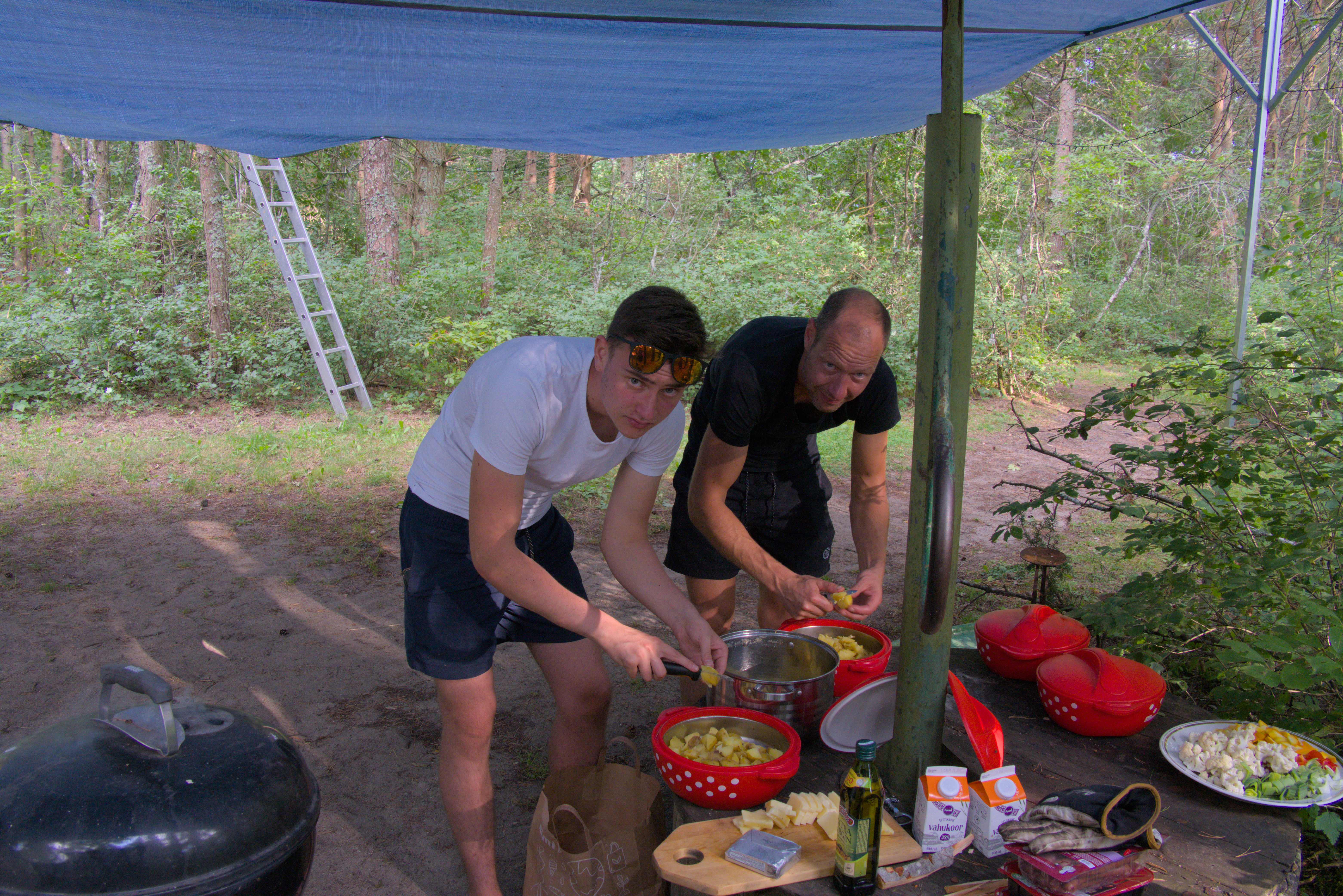 Ngu ikka olid toimkonnad. Köögis ja sauna juures. Kuidagi aastatega on välja kujunenud, kes mida teeb. Mehed tegelevad sauna ja grilliga, naised tegelevad salatite, "vegansodi" ja kartulitega. Kõik asjad saavad ühiselt tehtud ja nii on palju rohkem aega teha asju, mis kosutavad hinge. Robin ja Sebastian löövad kenasti kõigega kaasa ja ei ole asja, millega nad hakkama ei saaks. Noorte teema on ka vihad, mida sel korral oli kaks: kase oma ja kadaka oma. Anete tuli ka kohe ilusasti kaasa ja aitas köögis nii palju, kui sai. Lisaks oli ta kodus esimeseks õhtuks teinud meekoogi ja teisel õhtul keeras kokku Eaton Messi, mida kõik maiasmokad armastavad. Söögid olid kõik väga head, ainult selle peab meelde jätma, et kui on nii vähe inimesi, peaks salateid tegema vähem. Transpordimeeskond viis kõik asjad aida juurest sauna juurde ja õhtud olid meie päralt. Viimase päeva hommikul keetsime Anetega 15-le inimesele kaerahelbeputru. Ma ei ole kunagi pidnuda nii suures koguses putru keetma, sest ühe satsiga teeb seda Ailen ja teise satsiga tavaliselt Liivi, keda seekord saarel üldse polnud ja kuidagi juhtus nii, et mina pidin seekord pudru tegma. Ma ikka pabistasin väga, aga Anetega koos saime väga hea pudru tehtud. Aitäh Anete, et aitasid!